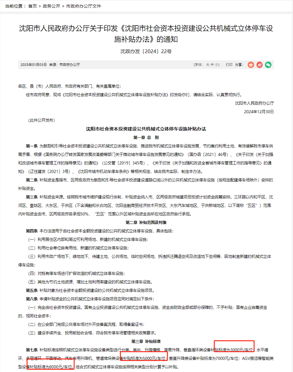 停車難,早已成為現(xiàn)代城市的“通病”,尤其在繁華商圈、老舊小區(qū),找個停車位簡直“難于上青天”。不過現(xiàn)在,好消息來啦!為緩解這一難題,多地紛紛出臺機械車位補貼政策,給咱們帶來實實在在的福利。 《沈陽市社會資本投資建設(shè)公共機械式立體停車設(shè)施補貼辦法》(沈政辦發(fā)〔2024〕22號)明確,升降橫移/簡易升降/垂直循環(huán)類車庫的補助標(biāo)準(zhǔn)為3000元/車位;水平循環(huán)/多層循環(huán)/平面移動/汽車專用升降機/巷道堆垛類為5000元/車位;垂直升降類7000元/車位;AGV搬運8000元/車位。組合式機械式立體停車設(shè)施按照相關(guān)類型分別計算予以補貼。 官網(wǎng)截圖: 官網(wǎng)截圖: 廣州《番禺區(qū)鼓勵社會力量投資建設(shè)公共停車場管理辦法》明確,對社會力量投資建設(shè)機械式停車庫,按"補助標(biāo)準(zhǔn)x補助系數(shù)x車位數(shù)"計算補助資金總額。補助標(biāo)準(zhǔn)為升降橫移類/簡易升降類8000元/車位,垂直升降類(塔式)/巷道堆垛類/平面移動式/垂直循環(huán)類/水平循環(huán)類/多層循環(huán)類20000元/車位。 官網(wǎng)截圖: 官網(wǎng)截圖: 財政部辦公廳和住房城鄉(xiāng)建設(shè)部辦公廳發(fā)布了《關(guān)于開展2025年度中央財政支持實施城市更新行動的通知》(財辦建〔2025〕11號),對超大特大城市以及黃河、珠江等重點流域沿線大城市,中央財政給予定額補助,支持實施城市更新工作。城市更新的樣板項目建設(shè)包括四類,其中包含機械停車設(shè)施等市政基礎(chǔ)設(shè)施提升改造。 這意味著,在城市更新的大框架下,機械停車設(shè)施的建設(shè)與改造將成為重要著力點之一,將促使更多城市將機械車庫建設(shè)納入城市更新規(guī)劃當(dāng)中,為車庫企業(yè)帶來重大利好。 官網(wǎng)截圖: 官網(wǎng)截圖: 這些補貼政策,對咱們潛在購買機械車位的客戶來說,好處多多。一方面,補貼政策會促使更多機械車位建設(shè),以后找車位不用再兜兜轉(zhuǎn)轉(zhuǎn),節(jié)省大量時間和精力;另一方面,補貼降低建設(shè)成本,購買或租賃機械車位的費用也會更實惠。機械車位不僅節(jié)省空間,還能讓車輛免受風(fēng)吹雨打、減少被刮擦風(fēng)險。 停車難題的破解之路,離不開政策的有力支持。如今多地出臺的機械車位補貼政策,無疑是一場“及時雨”,讓我們看到了便捷停車的曙光。但面對日益增長的停車需求,我們更期待未來能有更多城市加入補貼行列,進一步 擴大補貼范圍,提高補貼額度,細(xì)化補貼標(biāo)準(zhǔn),讓機械車位走進更多社區(qū)、商圈和寫字樓。也希望政策能不斷優(yōu)化升級,簡化申請流程,提升落地效率,真正讓惠民政策落到實處。相信隨著政策的持續(xù)發(fā)力,停車難將不再是困擾大家的煩心事,高效便捷的停車體驗將觸手可及!